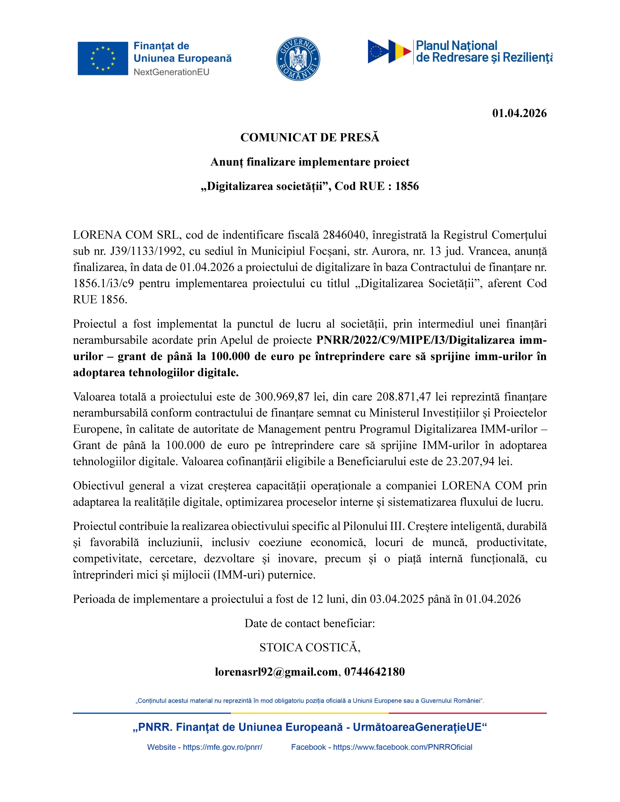LORENA COM SRL, cod de indentificare fiscală 2846040, înregistrată la Registrul Comerțului sub nr. J39/1133/1992, cu sediul în Municipiul Focșani, str. Aurora, nr. 13 jud. Vrancea, anunță finalizarea, în data de 01.04.2026 a proiectului de digitalizare în baza Contractului de finanțare nr. 1856.1/i3/c9 pentru implementarea proiectului cu titlul „Digitalizarea Societății”, aferent Cod RUE 1856.